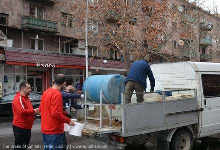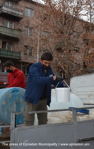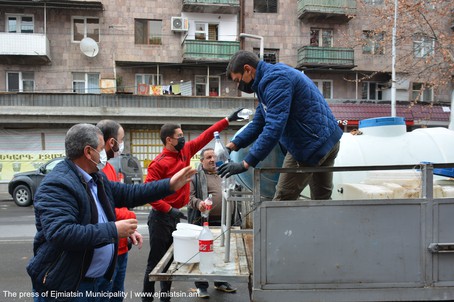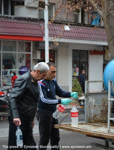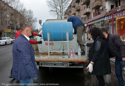 Նոր կորոնավիրուսի տարածման կանխարգելման միջոցառումների շրջանակում Էջմիածնի քաղաքապետարանը տնտեսվարողներին հատկացնում է ախտահանիչ միջոցներ՝ իրենց սպասարկման տարածքները պարբերաբար ախտահանելու համար: