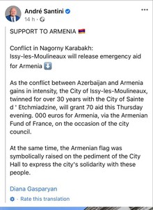 La ville jumelle d’Etchmiadzin Issy-les-Moulineaux s'apprête à accorder une aide de 70.000 Euros à l’Arménie. En plus, le drapeau de la République d'Arménie flotte à la mairie d'Issy-les-Moulineaux depuis hier en gage d'amitié entre l'Arménie et la France.