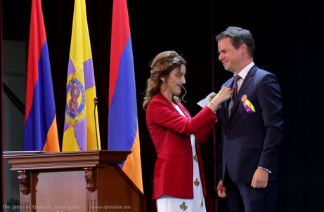 Էջմիածնի 2704-ամյակին քաղաքի բարեկամ կոչում շնորհվեց՝ ՀՀ-ում Ֆրանսիայի արտակարգ եւ լիազոր դեսպան Ժոնաթան Լաքոթին՝ Էջմիածնին ցուցաբերած աջակցության համար, բարերար Գոռ Սահակյանին՝ քաղաքում խաղահրապարակներ հիմնելու համար եւ ԱՐՄՍՎԻՍԲԱՆԿ-ի գործադիր տնօրեն Գեւորգ Մաչանյանին՝ Համահայկական խաղերի մեկնող Էջմիածնի պատվիրակությանը ցուցաբերած աջակցության համար:
