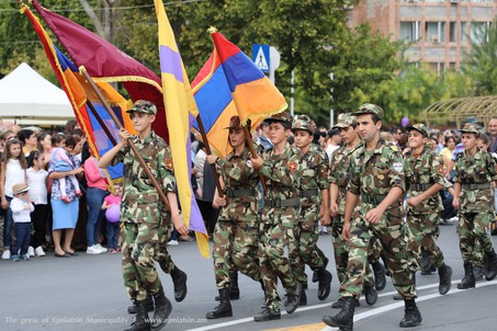 Երթի առջեւում Նիցցա քաղաքի նվիրած ավտոբուսներն էին, որոնք արդեն հանձնվել են շահագործման: Հաջորդաբար հրապարակ մուտք գործեցին խորհրդանշական Սահակ Պարթեւ կաթողիկոսը եւ Մեսրոպ Մաշտոցը՝ հայոց տառերով: